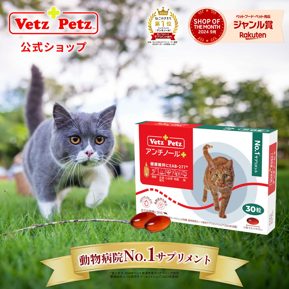 ※2016年1月~2022年9月 当社webの出荷実績 ・関節、皮膚・被毛、心血管、腎臓、神経・認知機能の健康を守るサプリメント ・ニュージーランド産のモエギイガイを使用し、余分な熱を加えず独自の製造方法で「PCSO-524」を抽出 ・さらに体への吸収を助けるクリルオイルを配合し、特別な海洋性脂質「EAB-277」へと進化 ・品質にこだわったサプリメントのため、長期使用にも安心 ・高齢猫への使用や薬との併用も可能 【商品詳細】 商品名 猫用 アンチノール プラス 原材料名